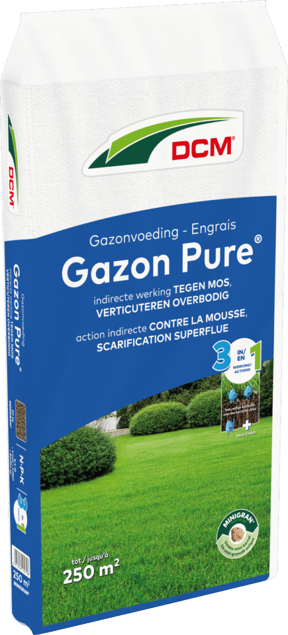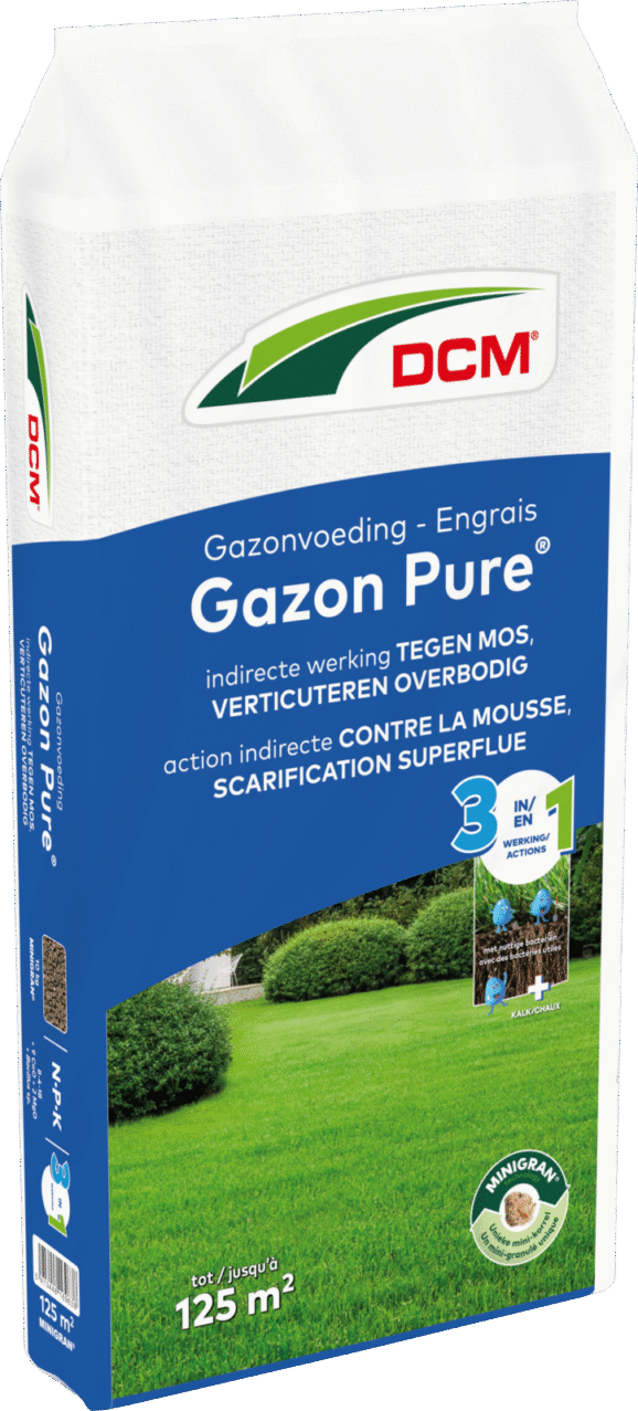 DCM Meststof Gazon Pure is een complete gazonmeststof met magnesium, kalk en bacteriën. Deze meststof heeft een indirecte werking tegen mos, vermindert de viltlaag en maakt verticuteren overbodig. De combinatie van minerale en organische bestanddelen zorgt voor een snelle en lange werking (100 dagen). Het hoge gehalte aan kalium zorgt voor een sterke en dichte grasmat die goed bestand is tegen betreding.