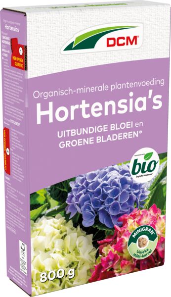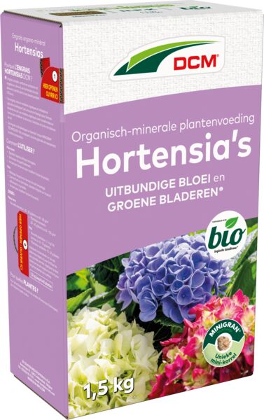 DCM Meststof Hortensia is een kaliumrijke meststof met magnesium voor alle soorten hortensia’s. Zorgt voor een uitbundige bloei en mooie, groene bladeren. Toepasbaar in de biotuin.