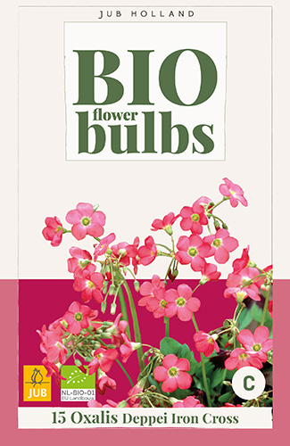 Oxalis deppei ‘Iron Cross’ bloeit met roze bloempjes. Oxalis wordt ook wel Geluksklaver genoemd. Het vierdelig groen blade heeft een purperrode vlek rond het hart. De Oxalis is een bodembedekker in de border maar kan ook goed in potten worden geplant.. Biologisch geteeld.