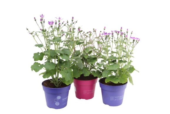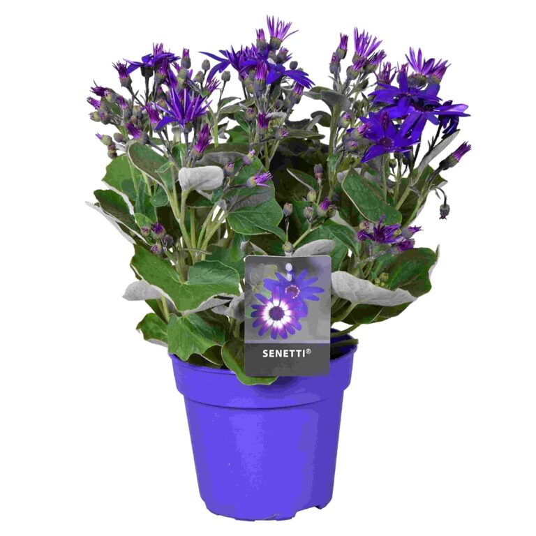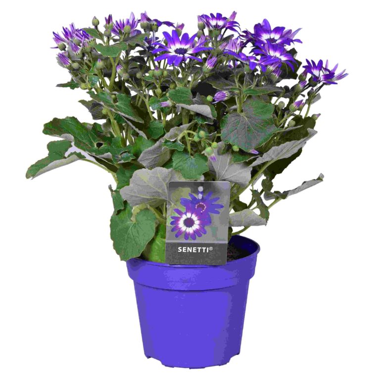 Deze uitbundig bloeiende, eenjarige voorjaarsplant staat bekend om zijn intense tweekleurige madeliefachtige bloemen. Ideaal voor potten en borders. Senecio senetti is verkrijgbaar in diverse kleuren.