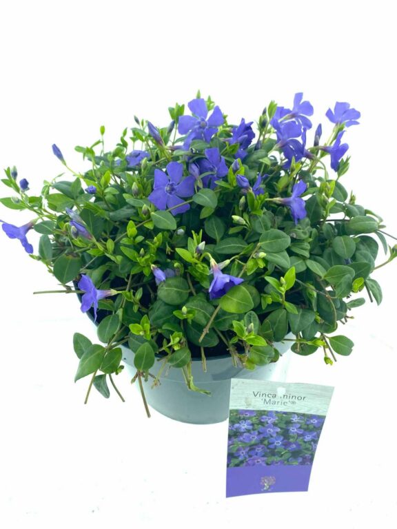 Kleine maagdenpalm is een groenblijvende bodembedekkende plant. De Vinca minor ‘Marie’ bloeit met paars/blauwe bloemen en heeft de voorkeur voor een plaats in de halfschaduw maar doet het ook goed op een andere standplaats.