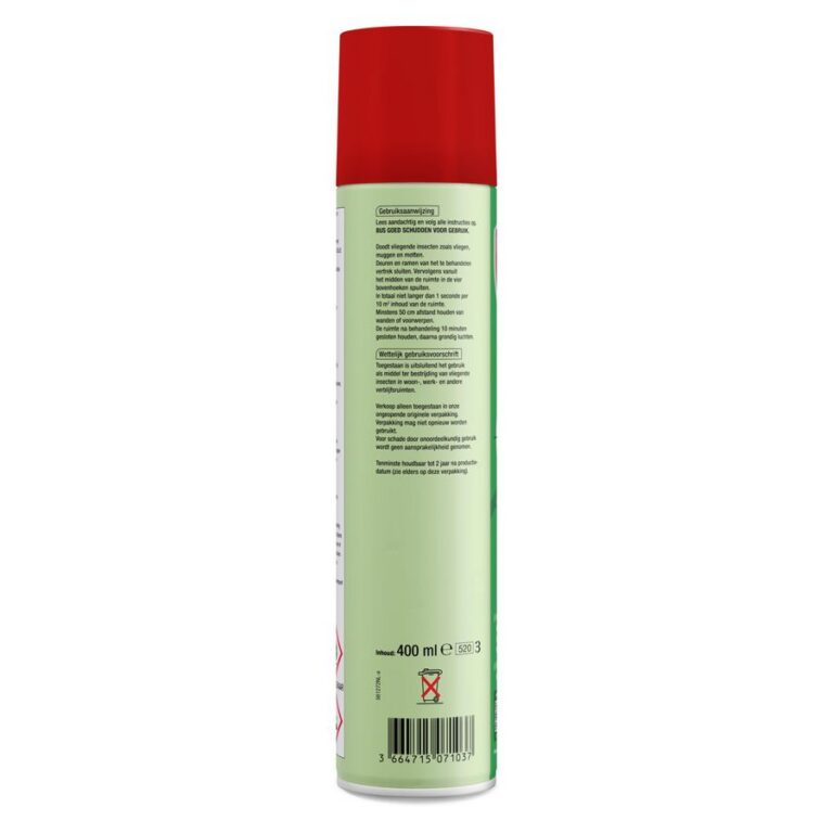 Vliegen- en Muggenspray is een krachtige omgevingsspray die effectief vliegende insecten bestrijdt, zoals vliegen, muggen en motten. De spray werkt snel en doeltreffend. Ideaal voor gebruik in woonruimtes, keukens, en andere binnen omgevingen waar vliegende plagen een probleem vormen.